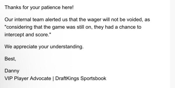 when I escalated it to DraftKings, their reason for refusal of voiding the bet was that “Houston still could have had a defensive TD” they never disputed their tactics that they freerolled me 14.9k, quite the contrary they implied it was very common.
