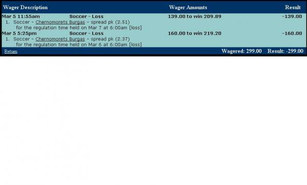 Me: Dear Wally! Why you did not agree with your mistake in the line? Date of the match in my bets is varying :March 6 and March 7. You can sure in that, just look at my Wager Description and you'll see
