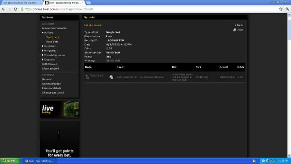 Today i come back home , log in to my account , check my betting history ...and see that the bet which was graded winner has been CANCELLED !!! NO E-MAIL from Bwin , i figure it out myself by coincidence ... Below are the screenshots... PLEASE HELP ME !!! WHAT CAN I DO AGAINST THESE CHEATERS ??