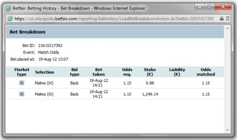 The stake was 1250 euro to win 187 euro. It is a not a lot of money but I feel robbed of my hard earned win.