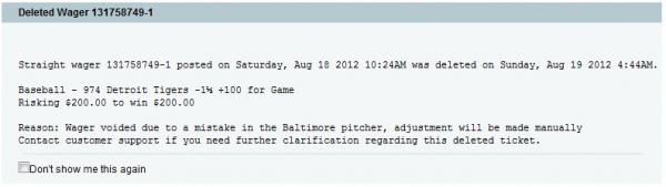 Today at 12:30 I saw that 5Dimes had the s.f giants @+166. Thought it was a great price and parlayed them with the Patriots ML first half and felt great about it. At around 2:30 after the Pats game was at halftime (6-6 score pats ml voided) I log into 5dimes and see a message that my wager was deleted due to a line error and the correct price was supposed to be +110 not +166. Then I click my pending wagers and the sf/pats wager is still their with a new ticket #. 5dimes had placed the same wager with the adjusted odds. They clearly state in the rules that they have the right to correct erroneous lines. However I've had baseball bets in the past (usually first five lines in baseball) where they would make a mistake with a line and they would void the bet and not place a new one with the adjusted odds.