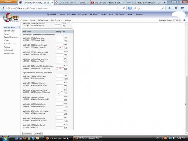 183612491-1* 6/12/13 9:32am Rolling If-Bet (Win Only) from ticket # 183610633-1. $130.77 $448.35 Pending 2 Team Parlay Pending 6/12/13 8:45am ATP Tennis 305 Mischa Zverev -210* vs Mirza Basic Pending 6/12/13 8:45am WTA Tennis 442 Nadiya Kichenok +200* vs Francesca Schiavone Comment -