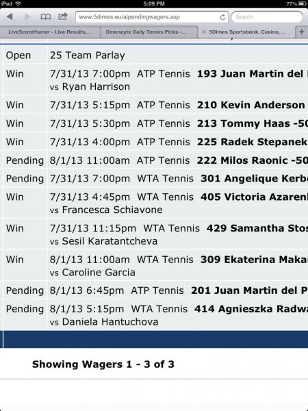 #1558Slot #3: 8-1 Raonic -400Originally posted by EaglesPhan36ATP Washington Open Parlay [7 slots]