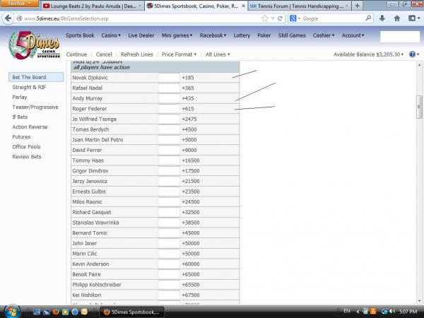 #5When betting futures, I tend to delegate my money in the fashion described above. 80% of the amount towards my top two choices (Muzza & Djokovic), a break even bet (Fed), and an exotic wildcard type of player (Berdych).Comment -