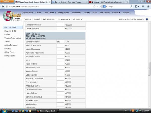#2She's always an easy take on futures when she is close to even, because you have a green out all the way through at plus odds on her opponent. As to why she won't cash.... because she's Serena and it's WTA. In other words, see Australia and Wimbledon this year.Comment -