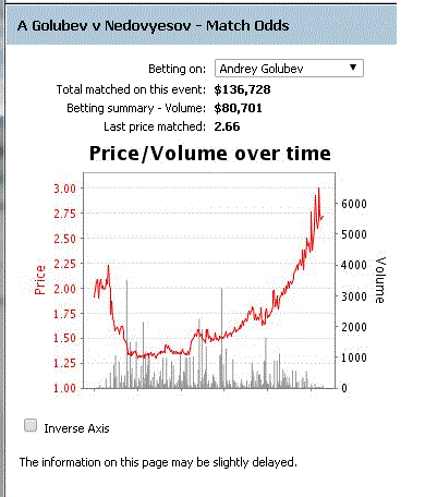 Both started around evens for the match, after winning the first set, on Betfair Golubev was around $1.26. As they hold serve in the second Golubev's odds have skyrocketed and is now currently $2.70 to win the match and has NOT DROPPED A POINT ON SERVE this second set.