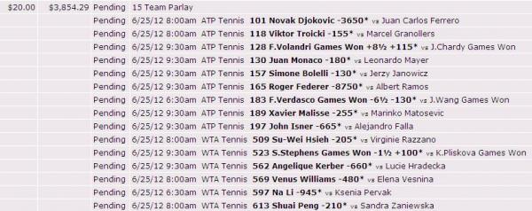 Anyway, enough with the boring stuff ... Let's start the sharing and discussion of ideas. Here's a couple parlay ideas for day one of Wimbledon.