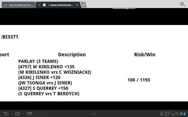 Parlayed kirilenko, sam and isner for 100 pays 1200!! 1/3 of the way there!!!