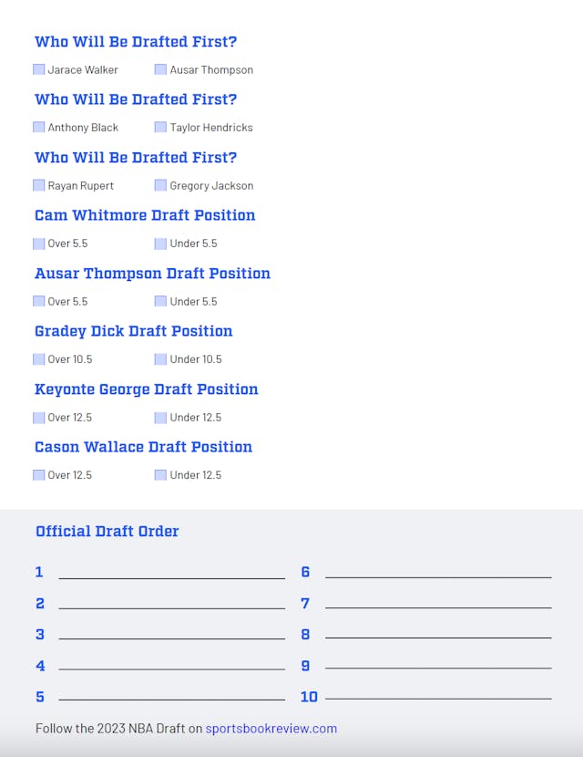 As draft night progresses, props featured on the NBA draft prop bet sheet, including picks on the top NBA draft position odds will be settled. As they are, simply check off which of the multiple outcomes apply.